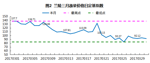(一)3月兰陵蔬菜价格指数环比和同比均下降,日价格指数呈波动式下行。本月主要蔬菜交易品种价格以下降为主,拉低蔬菜本月蔬菜价格指数;3月蔬菜价格日指数月末日为91.98点,比月初日下降45.72点,呈波动式下行。