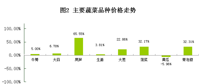场内行情:价格监测显示,本周主要蔬菜品种场内交易价格分别为每公斤大蒜3.78、莴笋1.97元、生姜4.90元、大葱1.72元、牛蒡0.84元、菠菜1.89元、黄瓜2.84元、青泡椒2.58元。